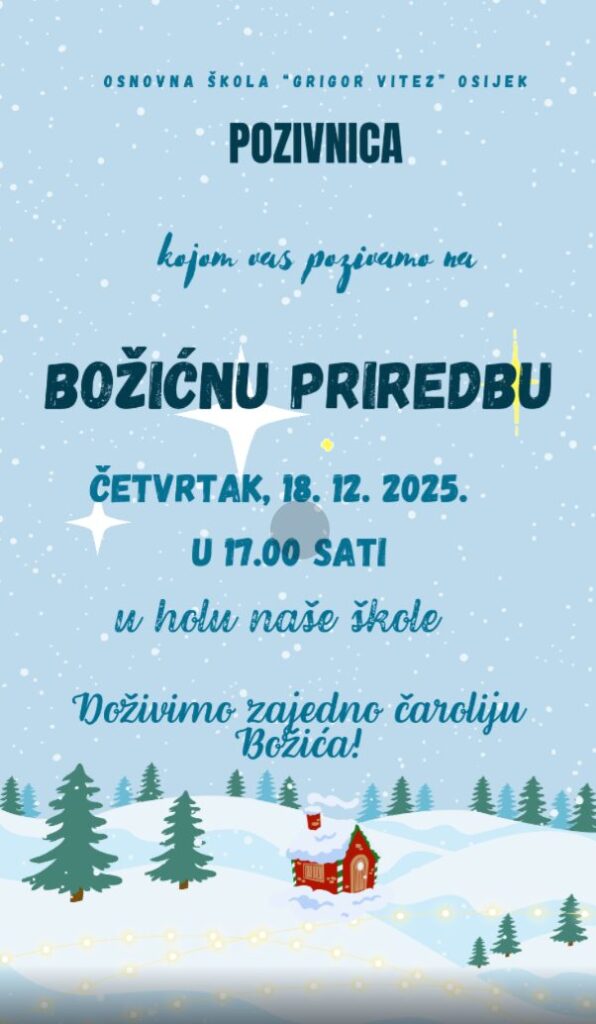 pozivamo vas na božićnu priredbu koja će se održati 18. prosinca 2025. u 17:00 sati u holu naše škole.