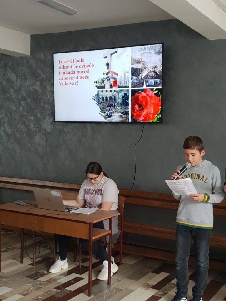 Svake godine 18. studenog s tugom sjećamo se žrtava koje su dane za slobodu Hrvatske. Kao i svake godine, i ove je godine u našoj Školi održan prigodan program kojim smo se posebno prisjetili žrtve Vukovara. Prikazane su životne priče pet iznimnih heroina i heroja Domovinskoga rata: Jean Michela Nicoliera, Kate Šoljić, Katice Zadro, Branka Borkovića te Željke Jurić Mitrović, „djevojčice u plavom kaputiću“.